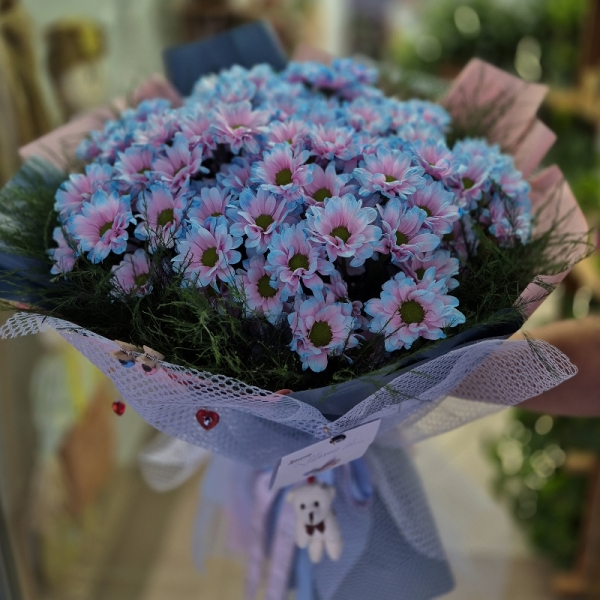 Ürün Kodu: FLA63ithal mavi renk papatyalarla hazırlanmış buket